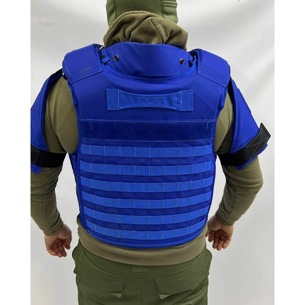 Бронежилет обеспечивает полную защиту благодаря своему баллистическому пакету, который включает переднюю, заднюю, боковую, плечевую, паховую зоны и шею. Бронеэлемент состоит из 45 слоев баллистической ткани из сверхвысокомолекулярного полиэтилена высокой плотности, обеспечивая надежную защиту от различных угроз.