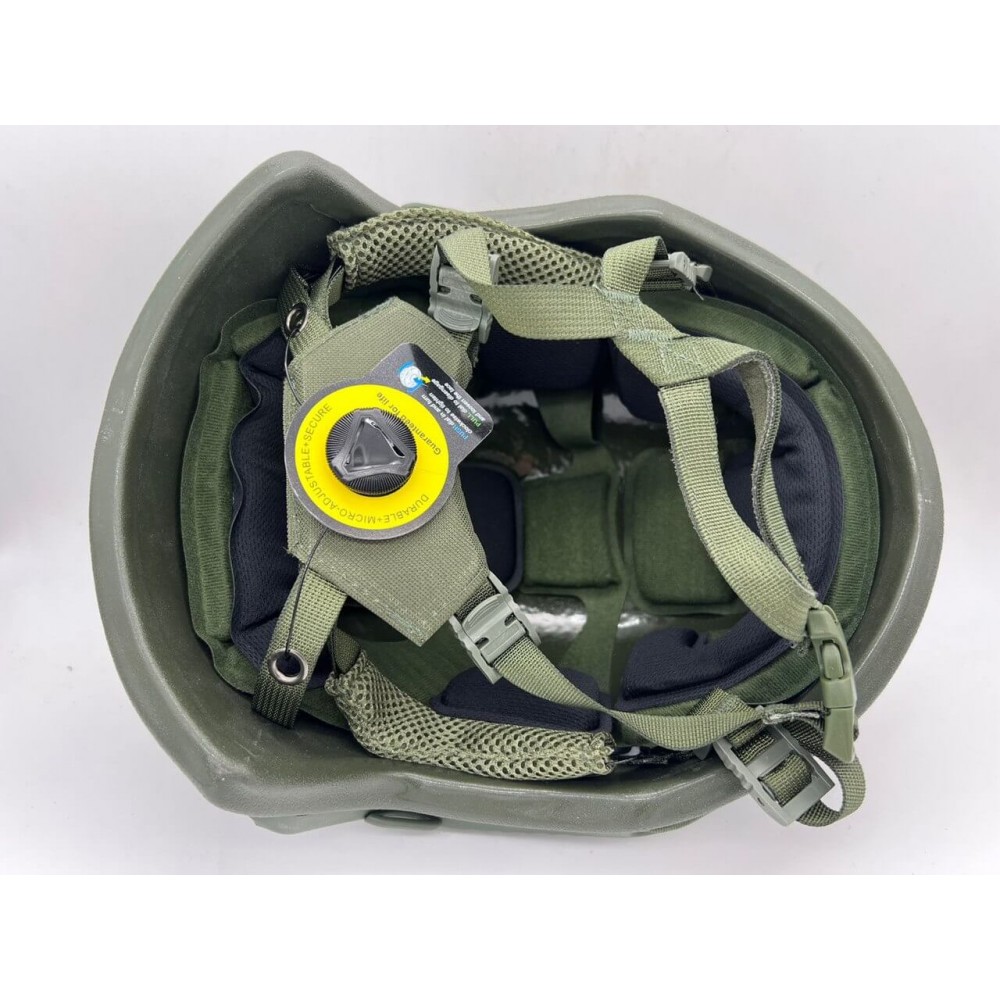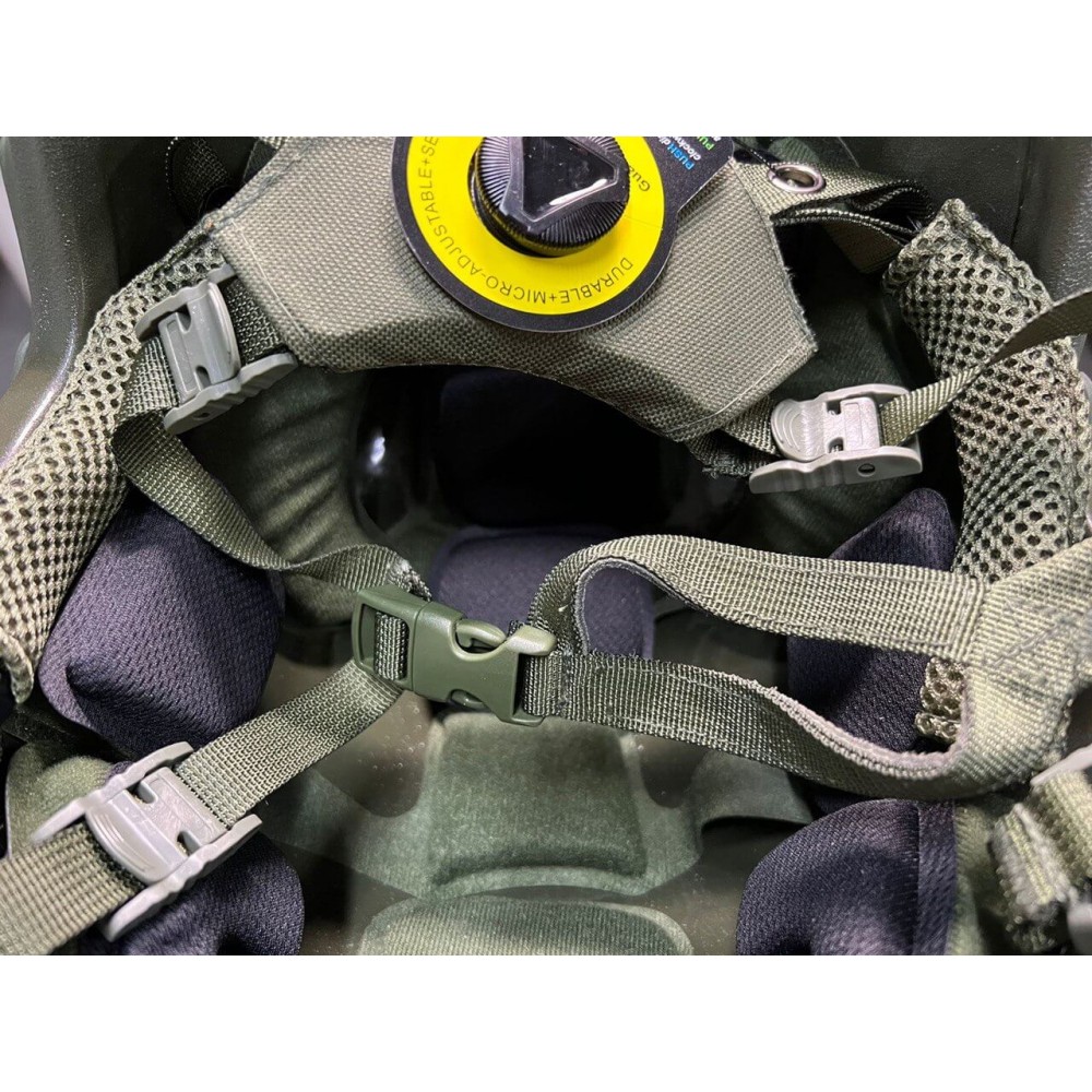 Баллистический шлем имеет четырехточечную систему креплений шлеек, регулируемую по объему и подбородку и демпфирующую систему подкладок (каждая вставка состоит из 2-х слоев: первый обеспечивает комфорт, второй поглощает удары) для смягчения заброневого воздействия при попадании.