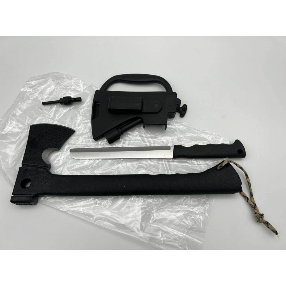 Тактический топор с ножом, огнивом и свистком - это многофункциональное тактическое снаряжение, разработанное для повышенной прочности и универсального использования в различных ситуациях.